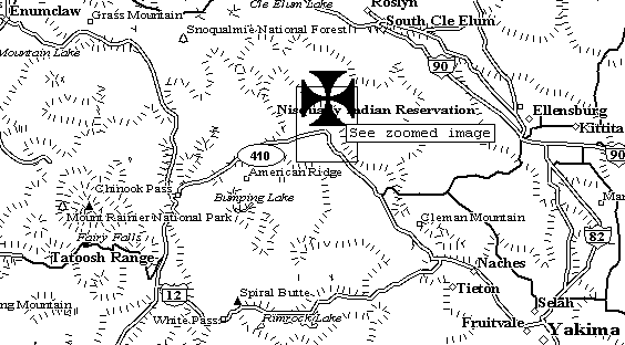 Get out your Washington maps. Find Mt Rainier National Park. On the eastern boundary is Hiway 410 heading east. The site is approximately 26 miles from Chinook pass.