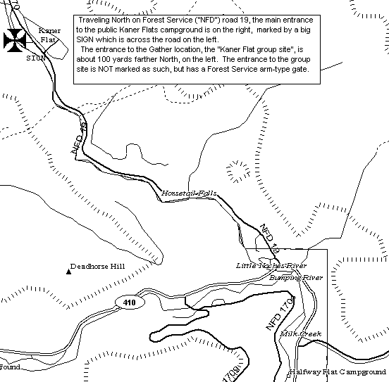 Its official. The 4th annual GPNDG (Gather) will be held July 7,8,9 at the Kaner Flats site, a reserved campground off the Naches river north of Washington Hwy 410, East Northeast of Mt. Ranier. (same as 1994). Greetings from the BOSS. Just 3 weeks until the Gather. Sheessss, time sure flies when you're having fun. Several people new to the list have asked what the heck this Gather thing is anyway so I thought I'd outline whats involved this year.
